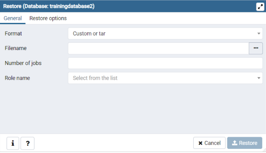 Let’s restore the back up by right clicking the trainingdatabase2 you just created. Choose Restore… > Filename > … and choose the .tar file you just saved.
